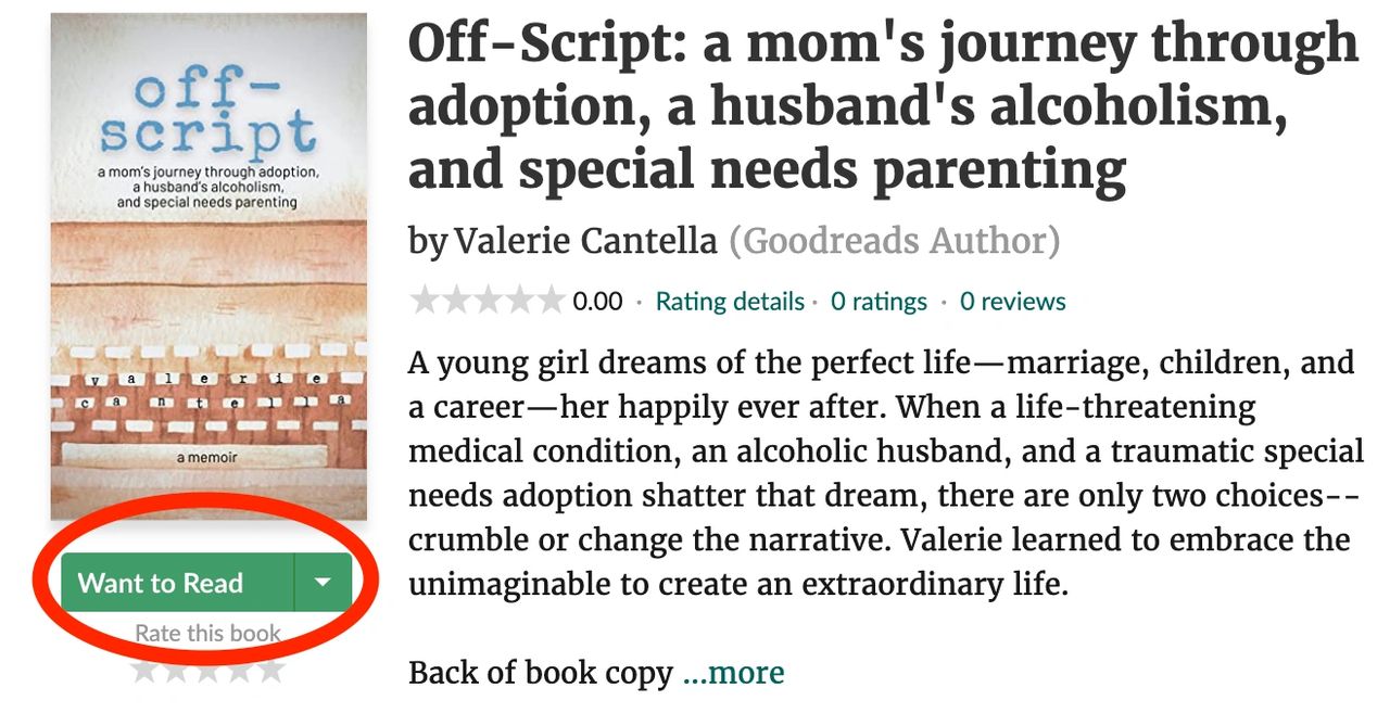 - Add off-script: a mom’s journey through adoption, a husband’s alcoholism, and special needs parenting to your WANT TO READ list on Goodreads